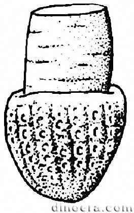 Tomiostrobus australis. Клубень и короткий конический стебель с присоединеными остатками нефертильных листьев