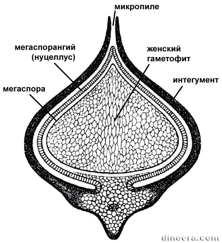 Lepidocarpon. a) - поперечное сечение мегаспорангия, показывающее его обертывание спорофиллом
