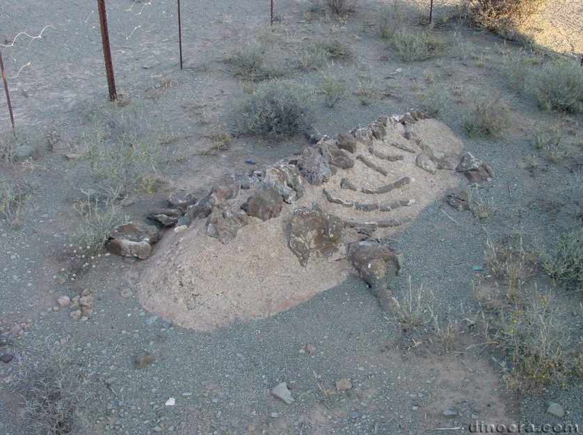 Вид скелета Bradysaurus baini, как он выглядел на месте раскопок в Bad после того, как его контуры были очищены и поверхностные кости удалены с головы