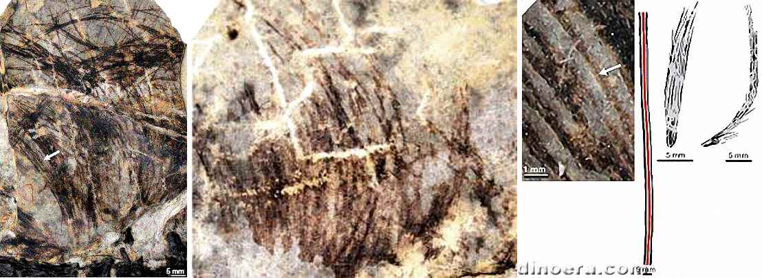 | Tianyulong confuciusi и Psittacosaurus | Сравнение "щетин" Psittacosaurus (вверху), протоперьев Sinosauropteryx (слева) и "волокон" Tianyulong (справа) |